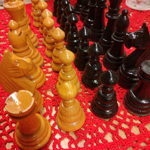 Sjakkspill i tre med brikker i to farger