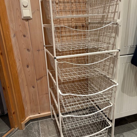 Hvit trådkurv hylle selges, da jeg ikke har bruk for den lengre. Brukt for oppbevaring av klær. Har noen merker på topp og bunn av stativet