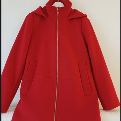 Stockh LM jakke i ull, farge rød, størrelse 40 for kvinner. Jakken har en enkel design med frontlommer og en ståkrage. Den er egnet for bruk som ytterplagg i kjøligere vær.