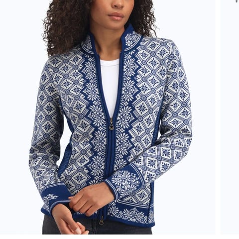 Vindstopper og vannavvisende Dale of Norway Genser i ull for dame, størrelse S. Genseren er flerfarget med tradisjonelt norsk mønster og har glidelåslommer. Materialet er ull, som gir god varme og komfort.