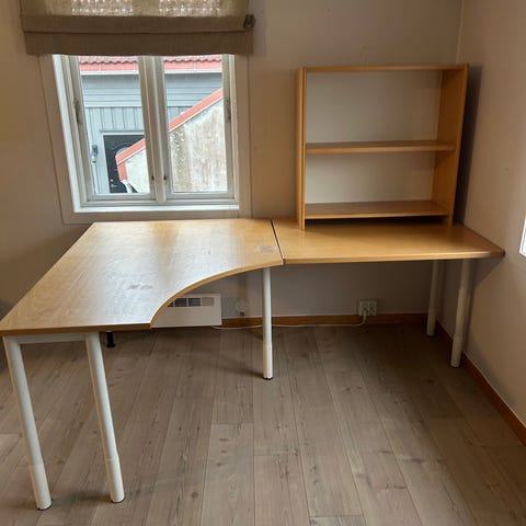 Skrivebord i Eik tror det er fra IKEA med flere skuffer, inkludert en skuff med hengemapper. Passer til kontorbruk og oppbevaring av dokumenter og kontorrekvisita.