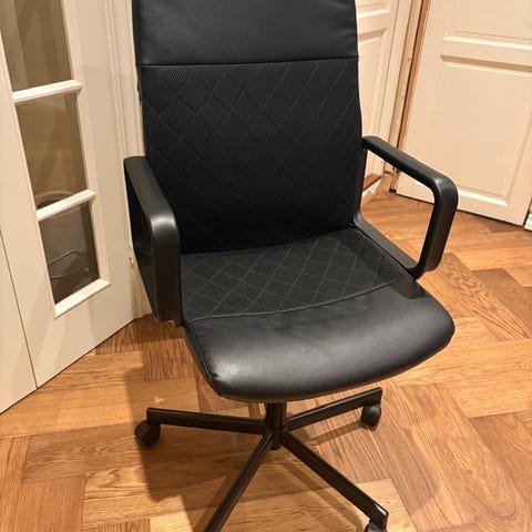 Den har/er både vippefunksjon, høydejusterbar, låsehjul, imitert skinn, mesh (pusteevne).