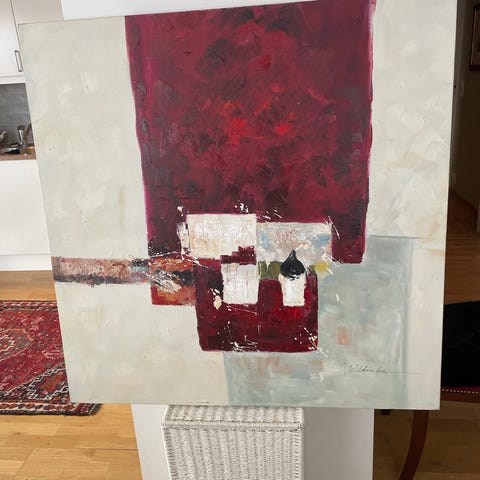 Abstrakt maleri som veggdekorasjon med hovedfarger i svart, grått og gul. Passer til innendørs bruk for dekorasjon av stue eller andre rom. Ble kjøpt på skeidar for 1499, selges rimelig! :)