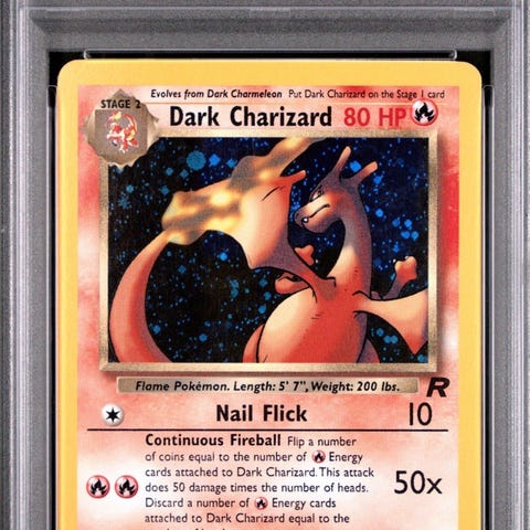 Dark charizard holo 1 edition i fra team rocket serien i PSA 8 til salg. Frakt er ikke inkludert i prisen.