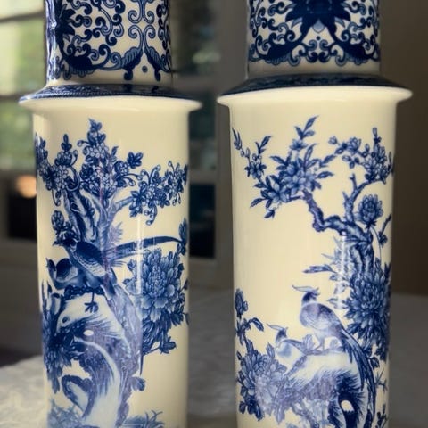 Nydelig Vintage porselens vase med fugle motiv i kongeblått og kremhvitt dekorativt mønster. Vasen har en stor rund form og passer som dekorativ gjenstand i hjemmet for all slags blomster oppsats. Vasen måler 26 cm i omkrets og i høyde, åpning på vasen er 9.5 cm.