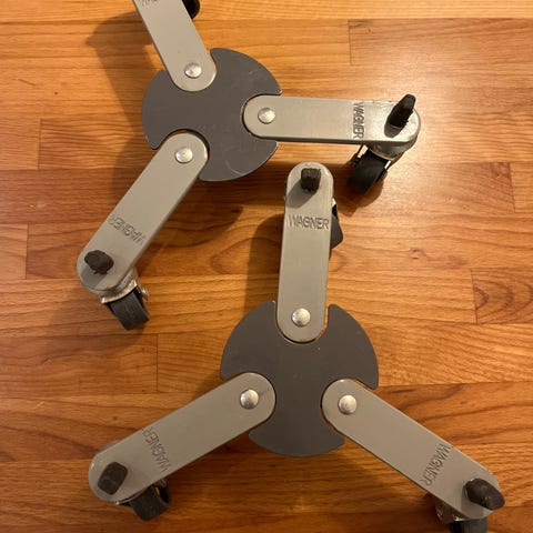 Rundt brett laget av tre med gittermønster. Utstyrt med fire svarte hjul for enkel flytting. 30 cm i diameter og 7 cm høyt. Jeg har satt det inn med voks slik at det tåler vannsøl bedre.