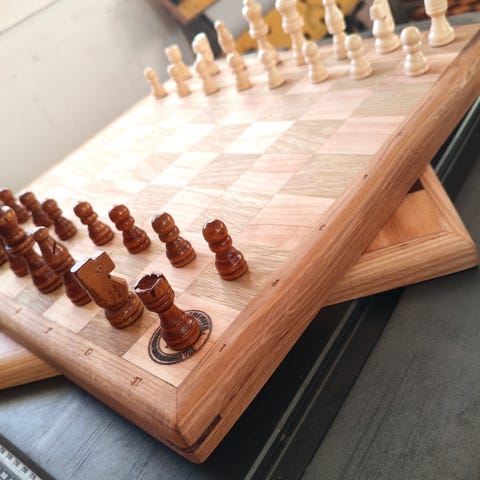 Håndlaget sjakkbrett, brettet er laget av valnøtt og hickory og rammet inn med zebrano tre. Brettet er ca 38 cm x 38 cm og ca 2,5 cm høyt. Her får du et brett som ingen andre har. Brettet kan sendes etter avtale.