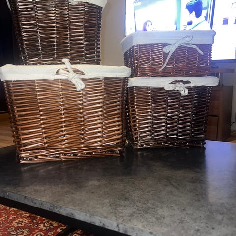 Kurvsett bestående av to kurver i flettet naturmateriale. Den ene kurven har lokk og kan brukes til oppbevaring, mens den andre fungerer som toalettpapirholder med plass til flere ruller .Matetialet gir et naturlig utseende og kan passe til ulike rom i hjemmet.