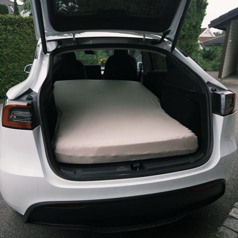 Tesla, Tesla Model Y, Tesla Model 3, bilcamping, camping i bil, car camping, overnatting i bil, campingmadrass, bilmadrass, Tesla madrass, Havnby, roadtrip, elbil, friluftsliv, biltur, sove i bil, oppblåsbar madrass, bagasjerom, bakseter ned, tilpasset madrass