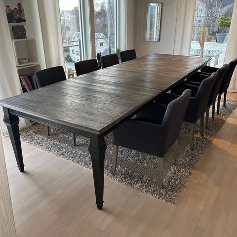 2 ilegg plater følger med. Med begge plater er bordet ca 370 cm langt.