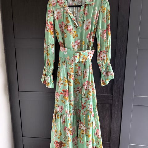 byTiMo Sommerkjole i størrelse XL, farge beige, laget av materiale i polyester og rayon. Kjolen har et mønster med blomstermotiv og lukkes med glidelås bak. Egnet som sommerplagg for kvinner. Er føret under livet. Nydelig stoff. Kjolen kan brukes som daglig kjole men også til fest.
