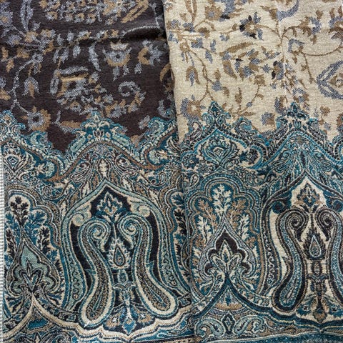 En nydelig og varm sjal i blandingsull med dekorativ blomstermønster i nydelige blå farger. Lengden er ca 177cm pluss 10cm frynser på hver side. Bredden ca 65cm. Kan brukes på begge sider. Veldig flott til jeans.