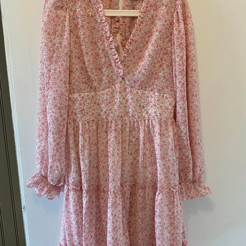 Fargen er dus rosa med blomster og passer til mange anledninger. Virkelig en pen kjole. Behagelig å ha på. Selger den ene som er ubrukt.