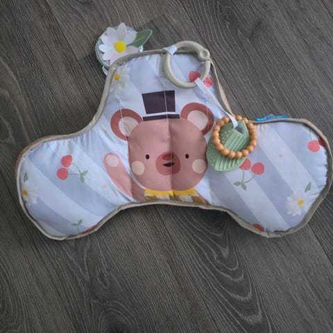 Lekene som henger på har div funksjoner, eks rangle, spiller musikk, knittrer, speil, tyggeleke osv. Se tekst over bildene.