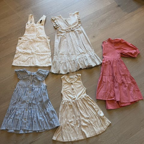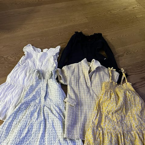 Kjoler. Blå 146. Blåstripet 140. Hvit 134. Sort med blomster 146.