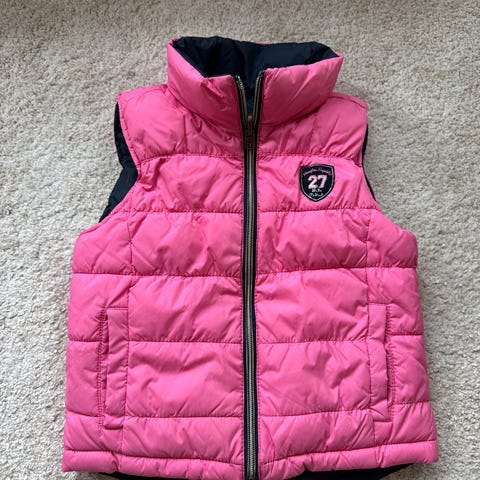 Lite og pent brukt oransje dunvest. Oppgitt størrelse er 7 år, men den er liten i størrelsen og passer etter min mening best til barn ca. 4–6 år.