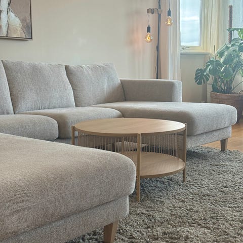 Er litt solbleket øverst på noen av putene fordi den har stått inntil et vindu. Ellers er sofaen helt fin! Har ingenting å si for bruken.
