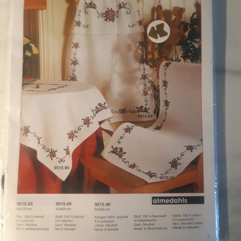 Kjøkkensett i 3 deler til å brodere selv. Hvitt stoff (50% lin og 50% bomull) med broderte mønstre i rosa og grønt. Inkluderer broderigarn i rosa, hvite blonder og til og med nål, så det er bare å sette i gang.