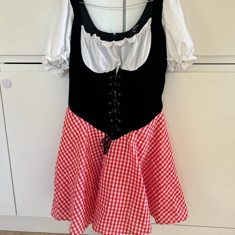 Dirndl i rød og svart med hvite puffermer som er sydd fast i kjolen. Kjolen er brukt bare én gang, selges derfor. Bra kvalitet og behagelig å ha på.