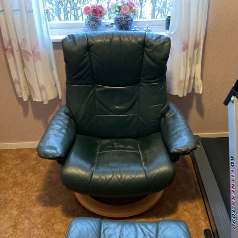 Sort stressless med elektrisk funksjon i fotskammel og rygg slik at den kan lenes helt tilbake i liggende posisjon.