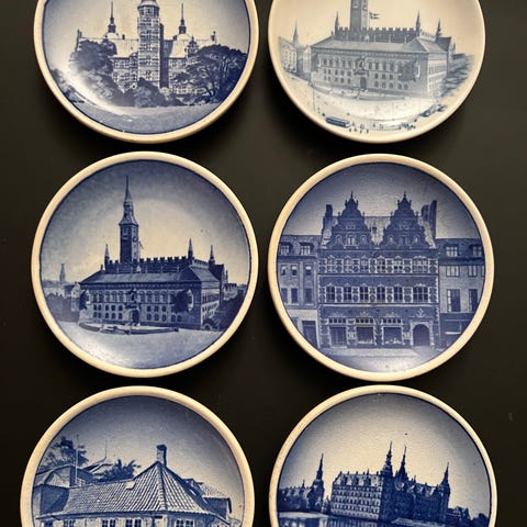 Aluminia dekorative miniplatter i potselen/fajanse med blått mønster som viser ulike motiver fra Danmark. Plattene har klassisk hvit porselensbakgrunn med blå dekor. Passer til veggoppheng som dekorasjon. Diameter 8cm. Gamle og fine. Oppgitt pris er for alle 5.