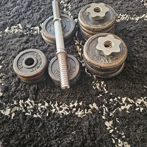Komplett manualsett, untatt én mutter. Gjenværende 3 muttrer er uten gummipakning. Har selve vektene på jobb, så derfor oppdaterer jeg annonsen med bilde på disse litt senere.
