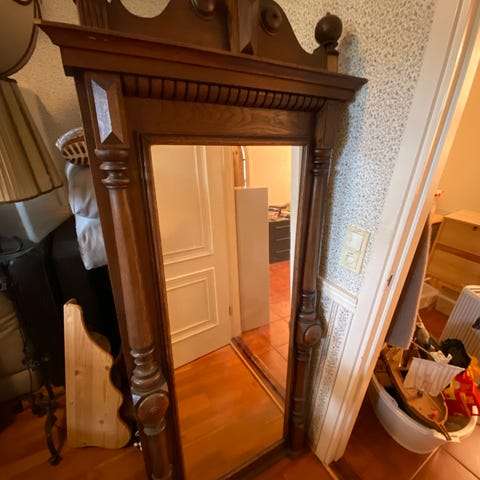 Kvalitetsmaterialer: Læret er av høy kvalitet og festet med dekorative messingsnagler til mørkt, massivt treverk.