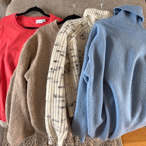 Selger syv strikkegensere fra kjente merker. De er i størrelse S, M og L. Fra Pepper, H&M, VeroModa og Bikbok. Nypris for alle ca. 4000. Selges for 990 samlet.