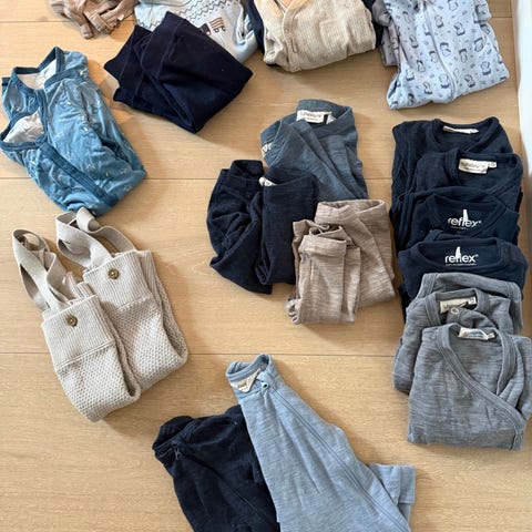 Bjørnesett og blå body er i ull. 1 pysj og 1 bukse i str 50, resten i str 56.