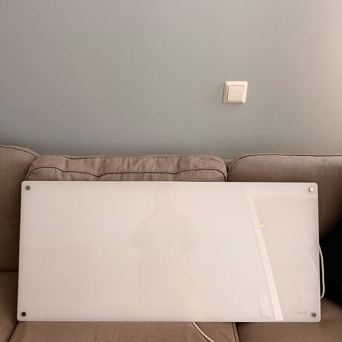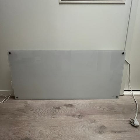 Mill Glasspanelovn elektrisk varmeovn i hvit farge. Ovnen har et glasspaneldesign og digitalt kontrollpanel. Egnet for oppvarming av rom. Den skrur seg på, men gir ikke ifra seg varme.
