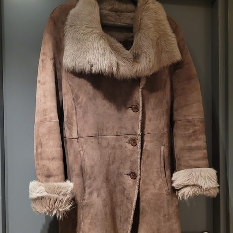 Lang jakke i ekte lammeskinn med pels krage