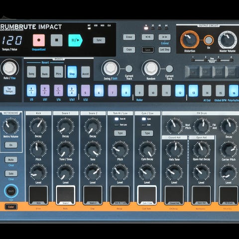 Den klassiske Drumbrute fra Aruria. Pent brukt i røykfritt studio. Dette er versjonen med hele 12 spor med ulike, justerbare perkusjons lyder - enkel og intuitiv å bruke. Tilkoblingsmulighetene er avanserte i tillegg til standard USB og midi. F.eks. kan alle trommespillene hentes ut separat og mikses etter ønske.