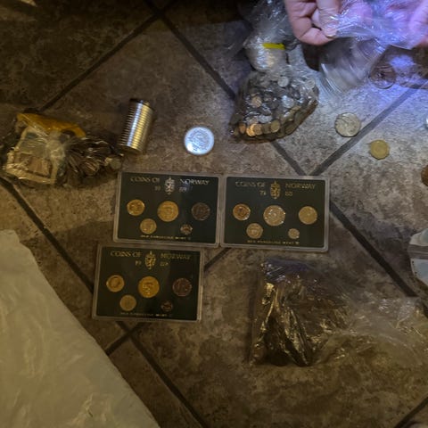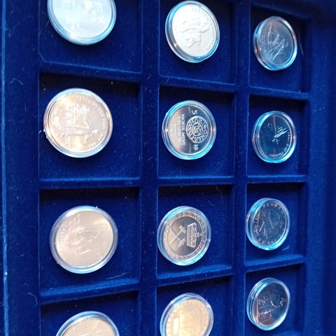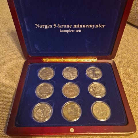 Samling av 9 minnemynter 5 kroner samt 1980 pålydende 5 kr presentert i et treskrin med sort etui med flere innfelte rom. Mynter lagret i beskyttende kapsler. Egnet for samlere og de som ønsker å bevare mynter på en organisert måte. 500 kroner/frakt. Se mine andre annonser på finn ved å trykke på navnet mitt så annonser.