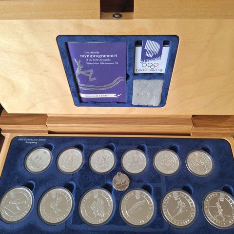 Samling av 9 usirkulerte 5 kroner samt 1980 pålydende 5 kr presentert i et treskrin med sort etui med flere innfelte rom. Mynter lagret i beskyttende kapsler. Egnet for samlere og de som ønsker å bevare mynter på en organisert måte. 300 kroner/frakt. Kan henyrs..Se mine andre annonser på finn ved å trykke på navnet mitt så annonser.