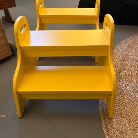 IKEA barnestige i blå plast. To-trinns design med sklisikre knotter på trinnene. Egnet for barn for å nå høyere steder på en trygg måte.