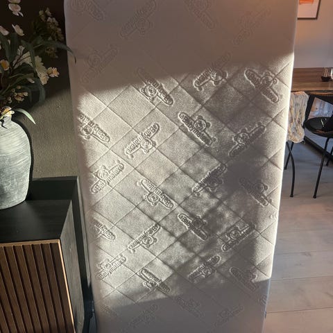 Jysk madrass med hvitt mønstret trekk. Passer til enkeltseng.