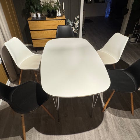 Selger et pent og solid håndlaget spisebord laget på bestilling i naturlig heltre, med 6 stoler.