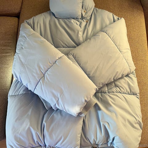 H&M pufferjakke i en nydelig blå farge er i str L men kan godt brukes av en str m alt etter hvor puffet man vil ha den ,,