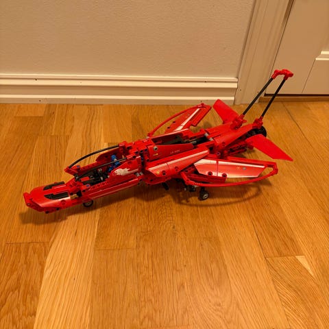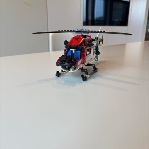 LEGO Technic helikopter i fargene rød og hvit. Modellen har roterende propeller og en krok for å heise opp gjenstander. Helikopteret er bygd med detaljer som cockpit og landingsskinner. Har litt støv på seg. 250 kr.
