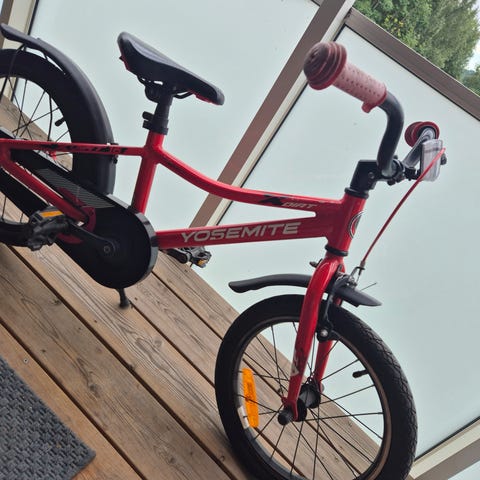 Solid og sikker barnesykkel med 16" hjul, aluminiumsramme og fast gaffel. Felgbrems på forhjul og navbrems bak. Leveres med støtte og skjemer.