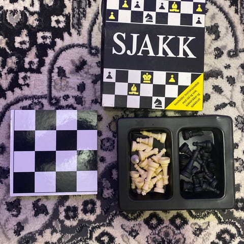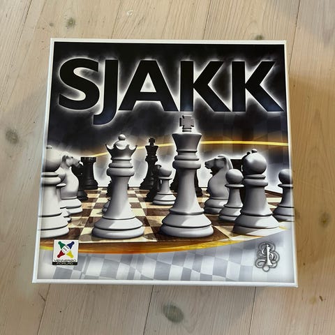 Sjakk brettspill med klassiske sjakkbrikker. Spillet inkluderer et brett og brikker for to spillere, brukt til strategisk spill.