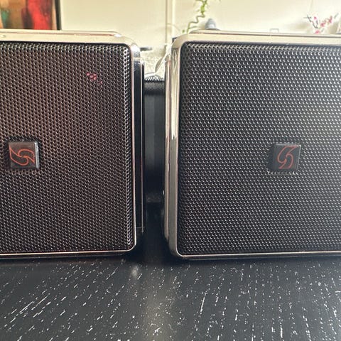 Brukt høyttalersett med normale bruksspor. Mindre riper og kosmetisk slitasje på kabinett og fot. USB-strøm og 3,5 mm lydkabel følger med og fremstår som hele. Ingen synlige sprekker eller manglende deler. Ikke funksjonstestet; antas å fungere. Retur aksepteres dersom varen ikke fungerer.