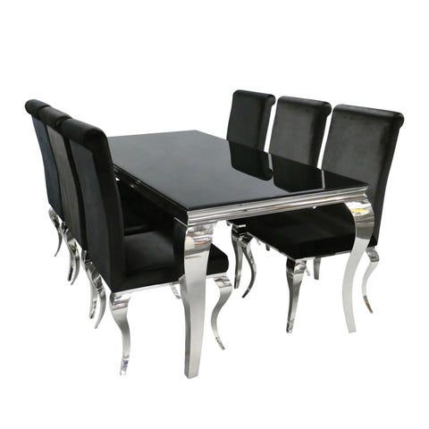 Spisebordsett bestående av et bord med svart glassplate og kromfargede ben, samt seks stoler med svart polstring og kromfargede ben.