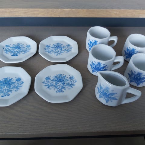 Teservise i blått og hvitt porselen med kopper, skåler og fat.