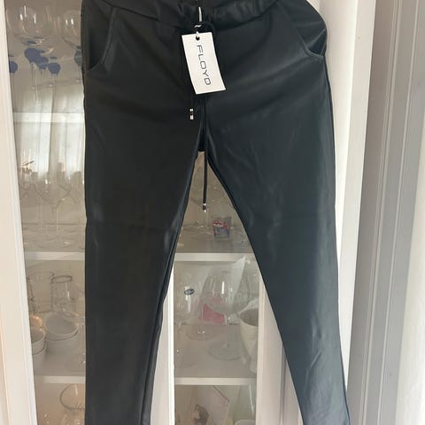 Imitert skinnbukse fra Floyd. Kun brukt en gang. Høy i livet. Sort farge og flott på.