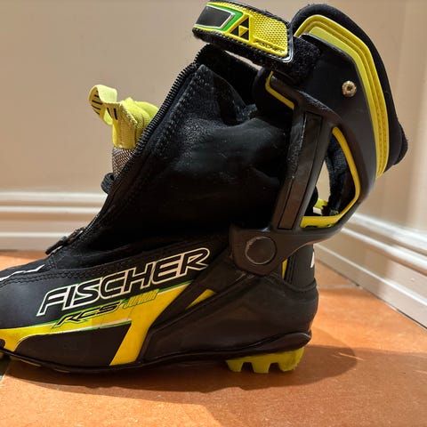 Fischer skøyteski støvler til junior. Brukt en sesong. Har fått noen merker på det hvite og litt av glidelåsen har brukket av.