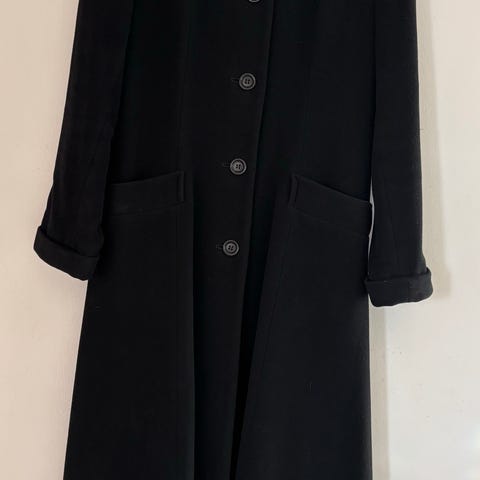 Svart kåpe med 70% virgin wool og 10% kasjmir. Kåpe med lekker hette og vakkert innsvinget for en flott feminin look. Dette er en ettertraktet klassiker fra designer Erich Fend og den henger des erte for mye i skapet mitt. Kåpen er noe lenger bak og har noen stilige armer. Hetten er nydelig å trekke over seg om det er ekstra kaldt. Kåpen er i tykk god ullkvalitet som gir mye varme. Jeg vil si den er normal i størrelsen. Ikke liten så kanskje en mellomting mellom 38 og 40.