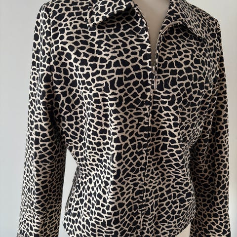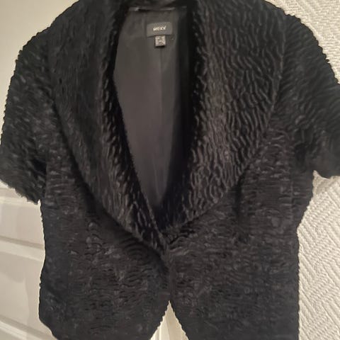 Bolero / kort jakke. 3/4 lange ermer. Lukkes med 2 hemper. 41 cm fra topp til bunn