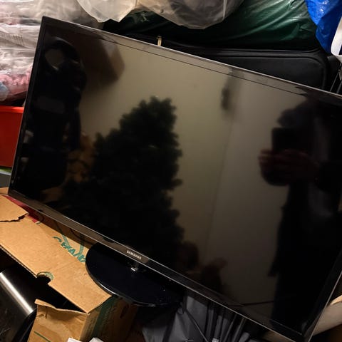 Samsung TV med veggmontering. Sort farge, flat skjerm.