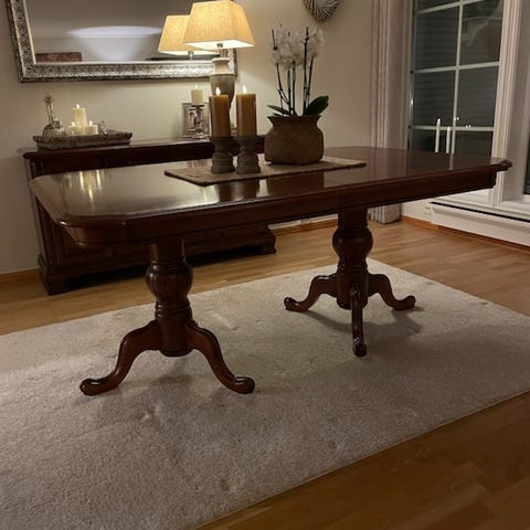 Pent brukt bord og stoler. Et skap.